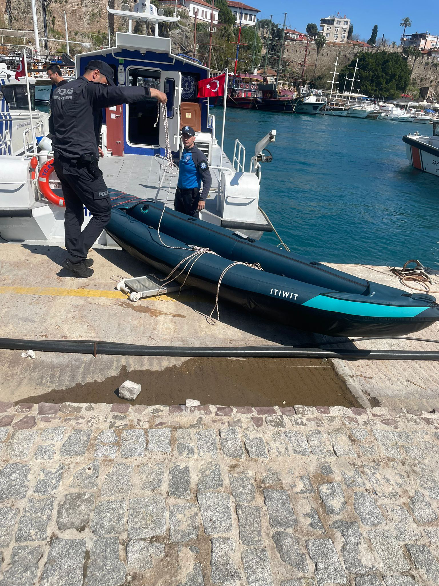 Olay, saat 14.30 sıralarında Atatürk Parkı falezler mevkisi açıklarında meydana geldi. Deniz polisi ekipleri rutin devriye görevi kapsamında seyir halindeyken falezlerin yaklaşık 200 metre açığında deniz yüzeyinde çırpınan ve yardım isteyen kişiyi fark etti. Ekipler, dalgalar arasında güçlükle fark edilen kişinin bulunduğu noktaya hızla yöneldi. Rüzgarın etkisiyle oluşan dalgalar nedeniyle su üstünde kalmakta zorlanan ve bitkin düştüğü görülen kişiye dikkatli şekilde yaklaşan deniz polisleri, ardından onu bota aldı. Kaleiçi'ndeki Deniz Limanı Şube Müdürlüğü'ne götürülen, suda çok zaman geçirdiği için üşüyen kişinin Turgay T. olduğu belirlendi. Deniz polisi, yorgun ve bitkin düşen Turgay T.'nin vücudunu, termal battaniye ile sardı. Kısa sürede limana ulaştırılan Turgay T., kendisini bekleyen sağlık ekibine teslim edildi.